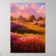 This digital artwork showcases a vast field covered in lush green grass and delicate pink flowers. In the distance, a few trees can be seen silhouetted against a sky filled with warm tones from the setting sun. Rays of sunlight shine through the clouds, creating a peaceful and serene atmosphere. The perfect addition to any space in need of a touch of natural beauty and tranquillity.