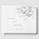 This elegant quiet luxury wedding guest book features white sculptured roses on a white background, bride and groom name in an elegant modern font and handwritten script.