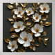 Ornate design featuring several artistic floral elements. The flowers are depicted in white with golden outlines, showcasing intricate details in the petals and centres.