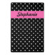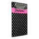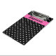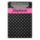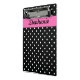 Black and white polka dot pattern mini clipboard. White polka dots on black and in the middle there is a hot pink band where you can add your text.