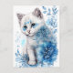 An adorable illustration of a white and blue kitten with blue flowers detail