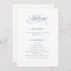 These elegant, simple white wedding welcome programs feature classic and luxe dusty blue calligraphy for a timeless, fancy look.