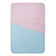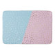 Bath mat with white and gold dots on blue and pink background.