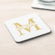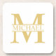 featuring gold personalised monogram in classic serif font style with box of name in the middle of monogram on white background.