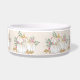 A pet bowl with fancy watercolor white pumpkins with accents of faux gold glitter. Surrounded by green leaves and pink wild flowers.