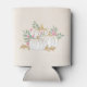 Can cooler with fancy watercolor white pumpkins with accents of faux gold glitter. Surrounded by green leaves and pink wild flowers.