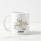A mug with fancy watercolor white pumpkins with accents of faux gold glitter. Surrounded by green leaves and pink wild flowers.