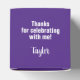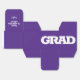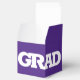 GRAD in bold white lettering wraps around the front of these purple 2" square graduation party favour boxes with your name and thank you message on the top.