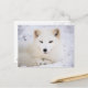 Photo of a cute white arctic fox resting in the snow. The animal has white fur and brown eyes and is looking at you. A real diva! Matching stamp: