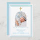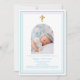 A white background, decorated with a baby blue, light blue frame, and a golden cross Personalise and add a photo name and details. Blue text. Arch shaped photo frame.