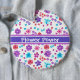 A pretty round Button or Badge, with a pattern of bright flowers in purple, turquoise, pink and orange on a white background, from a handpainted paper collage by Judy Adamson. You can easily change the background colour, if you wish, by using the Edit button.