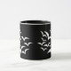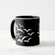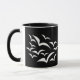 This black and white ringer mug features a collection of simple images of bats flying together in a cloud pattern. The bats are white and the background is black. Kids are sure to love this cute design.