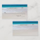 Lovely beach themed wedding reception place cards, with a photograph of a sandy white beach and clear blue water. Text in brown can be personalised to read what you want. Hand write each guest's name and table number on the cards.