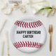 Extreme close-up of a white baseball with red stitching, customised name, and happy birthday text.