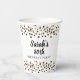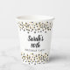Elegant black and gold confetti glitter on a white 80th birthday party paper cup. Personalised with the name of the guest of honour and her age.