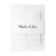 The White & Black Minimal Script Wedding Invitation Belly Band is a chic and elegant accessory that enhances your wedding stationery. With a crisp white backdrop complemented by bold black script, this belly band wraps around your invitations, prominently showcasing your names or initials. Ideal for couples who appreciate a modern, clean aesthetic, it not only organises your suite but also adds a sophisticated touch that reflects your unique style, ensuring your special day is both memorable and stylish.