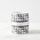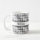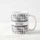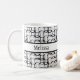 The surface of this mug is covered in a funky, retro white and black pattern with rows of overlapping, open circles. Through the centre is a black-bordered white band. A first name has been added over this band to both sides of the mug. You can add your name where the placeholders appear, write something else, or remove the words altogether. The font can also be changed to another if you like! It's great to play with this design and make it your own. Personalising and editing is fun!