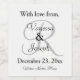 Elegant crisp white background with black text wedding reception favours. Insert monogrammed last name initial in centre in elegant silver script. With the wording written in black text, With Love From, Groom and Bride's First Names, Wedding Date. Type in Wine Name or delete text box field. Design by TamiraZDesigns.