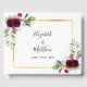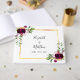 On front: A modern elegant guest book decorated with watercolored roses in burgundy with feathers and greenery. With a faux gold frame. Templates for your names and wedding date. White background. The names on front are written with a modern and trendy hand lettered style script. Black coloured letters.