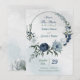 Beautiful botanical save the date card featuring white, dusty blue and navy blue flowers with green leaves on a green circle forming a pretty romantic wreath.
