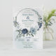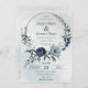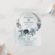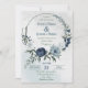Beautiful botanical wedding invitation featuring white, dusty blue and navy blue flowers with green leaves on a green circle forming a pretty romantic wreath.