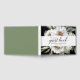 This white botanical guest book features white flowers with olive green leaves on the front on a black background. The text says "Wedding guest book" and includes the bride and groom's name and wedding date on the front and "the wedding of (bride and groom's name) and date on the spine. Text can all be customised to fit your needs.