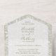 Elegant white botanicals and dots on a light sage green background (or any colour), these tri-fold wedding invitations feature your details in chic lettering in sections and a detachable RSVP card for guests to complete and return. **REMEMBER to put a stamp on the RSVP card and include envelopes on your order to mail invites! MORE COLORS in our store.