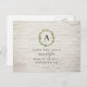 A wedding save the date postcard featuring a green wreath with monogram over a white brick background. Matching wedding invitations and other coordinating items can be found at Jill's Paperie.