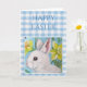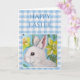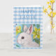 Sweet white bunny enjoys the spring flowers. Blank Happy Easter card. Image from my original art.