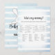 Enjoy playing this Who's My Mummy? baby shower game on soft, blue and white watercolor stripes background. Cute, white, bunny rabbit on back with templates created for you.