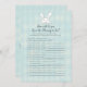 A white bunny rabbit above game title with baby aqua blue, diamond argyle background. Templates created for you. This is a Who knows mummy-to-be best baby shower game.