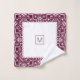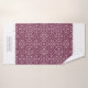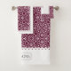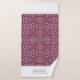 White and burgundy red damask pattern and white scalloped borders Bath Towel Set. The bath towel features an elegant white and burgundy damask pattern and white bands on the short sides with scalloped edges. There is also a frame with your family name. The hand towel showcases a scalloped border around it while the whash cloth is white in the centre with a damask border and your monogram. You can personalise it with your family name and monogram.