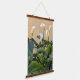 Decorate a living space with this vertical, hanging wall tapestry with wooden tops that features a photographic image of fluted, white Calla Lilies along with their green, leafy foliage. A lovely, floral image!