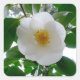 A photo of a white Camellia in a tree against a background of leaves and the sky.