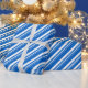 A classic candy cane stripe holiday wrapping paper featuring a white candy cane stripe on a bright capri blue colour background.