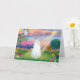 An angel appears in the clouds as the sun breaks through and a rainbow brightens up the sky as a white American Short Haired cat sits in the cool grass.