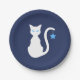 A silhouette cartoon of a white cat with blue eyes on a navy background. A blue star dangles from the cat's tail.