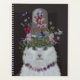 Cat, White with Butterfly bell jar, on black by FabFunky. Features a fabulous white cat with birds, greenery, and butterflies atop its head. | 191532D