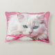 Beautiful white cat with blue eyes and tangled pink ribbons on pink.