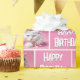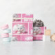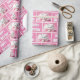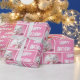 Beautiful white cat with blue eyes and tangled pink ribbons on pink.