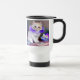 Travel Mug featuring a gorgeous white kitten! A fluffy kitten wears a purple flower collar. A blue bowl of white and purple flowers sits to the right. A marvellous gift for cat lovers and Victorian art enthusiasts!
