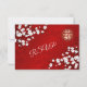 White cherry blossoms on a shimmering red background and a gold double happiness symbol. RSVP Chinese Wedding Card.