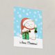 Smiling white cat in a traditional red Christmas hat holding a large wrapped present is wishing everyone a very Merry Christmas! In its left paw the cat is holding high a golden bell with a green bow.