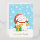Smiling white cat in a traditional red Christmas hat holding a large wrapped present is wishing everyone a very merry Christmas! In its left paw the cat is holding high a golden bell with a green bow. Cute and original Christmas party invitation!