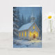 A charming church, nestled in a snowy forest landscape, glows warmly from its illuminated windows, creating a beautiful contrast with the cool, tranquil surroundings.