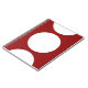 This bold geometric pattern features a large white dot in the centre and two white half circles on the edges of a red background.