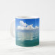 Start your day off right with our coffee mug with a relaxing scenic painting of a fluffy white cloud in a clear blue sky reflected in a calm turquoise ocean.