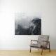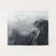 Dark, almost black and white photograph of white clouds covering rocky mountains.