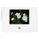 A photograph of white cosmos flowers, looking like a little cosmos of stars in amongst the leaves. The card has been left blank inside but can be further customised.