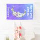This cloth banner has a white crescent moon with a pretty face and decorated with colourful abstract shapes in purple, yellow and blue on a mix of purples and blues background. Customise your text with the templates.